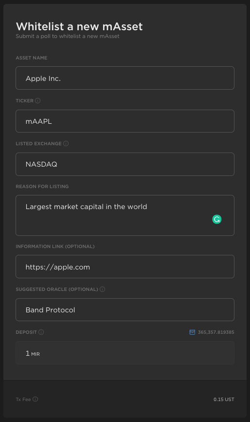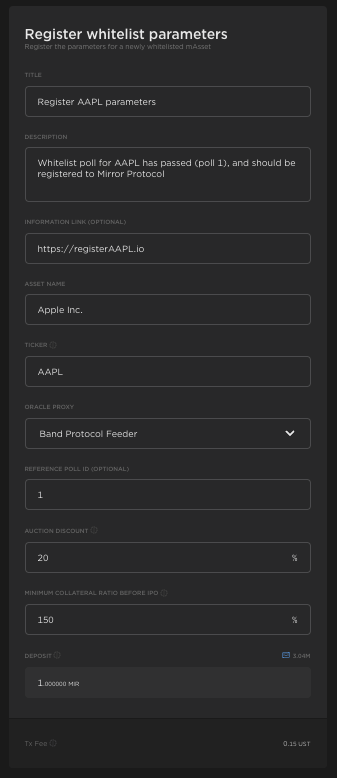 If a proposal to whitelist is approved, another poll must be passed to set the parameters of the newly listed asset. The required fields include Title, Description, Asset Name, Symbol, Oracle Provider, Auction Discount, and the Minimum Collateral Ratio. Again, it is advised to include reference to the passed whitelist poll as well as reasoning for choosing the given oracle address. Given that the Mirror Protocol is in its early stages, it is advisable to keep the parameters equal to existing parameters for already listed assets (Auction Discount at 20%, and Minimum Collateral Ratio at 150%).