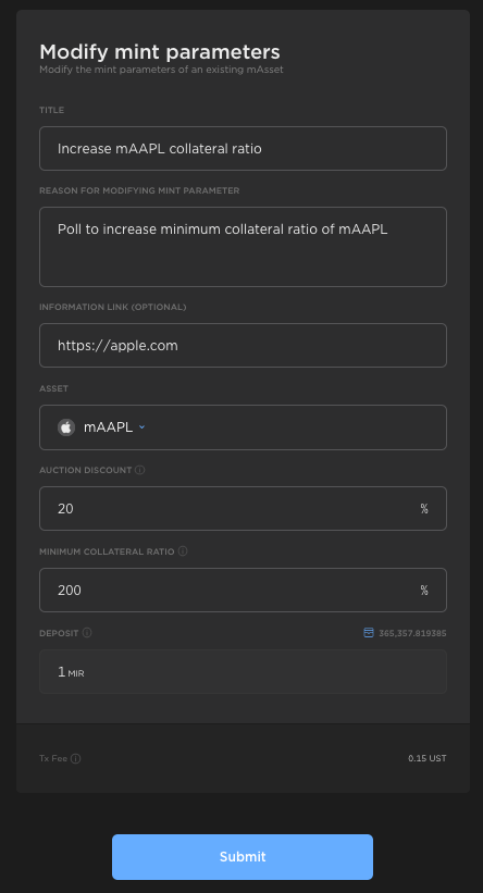 Through this poll, the existing Mirror Protocol parameters for a specific individual mAsset can be modified. The possible parameters to be updated consist of either the Auction Discount and the Minimum Collateral Ratio.