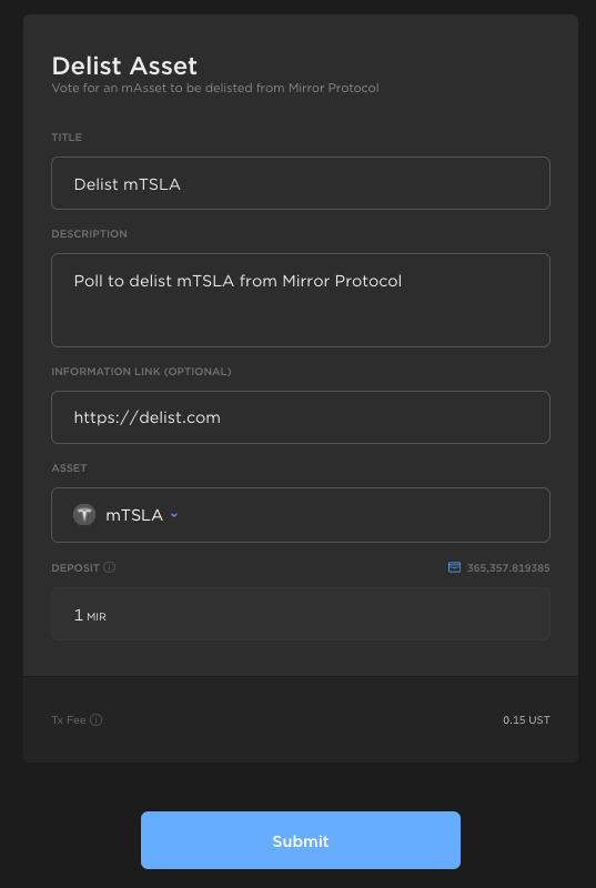 After the proposal to suggest Pre-IPO asset is approved, an additional poll to register the asset to Mirror Protocol must be submitted and executed.