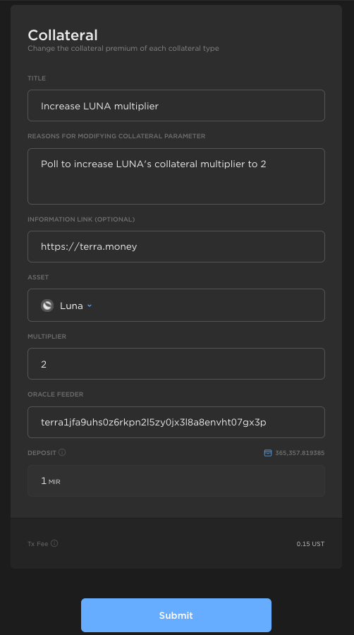 | Collateral (Asset) | Droplist of collateral types on Mirror Protocol, which to modify parameter for | Required |