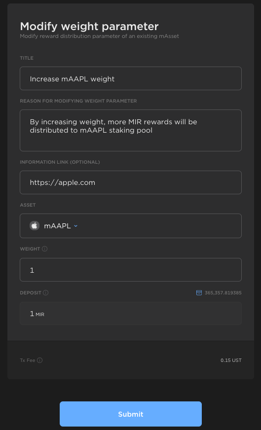 | Asset | Droplist of mAsset on Mirror Protocol, which to change weight parameter for | Required |