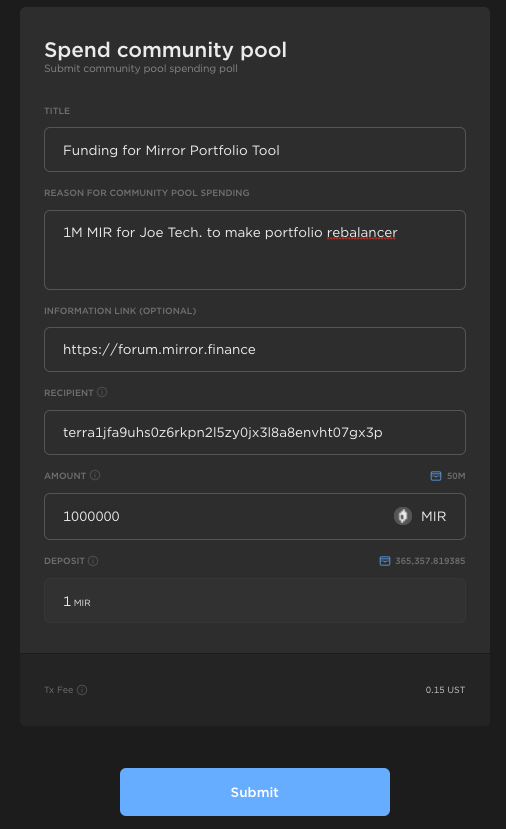 Proposals relating to spending the accrued MIR tokens in the community pool can be made under this section. The proposal should ideally specify the reasons for the distribution and identify the recipient and amount to be given.