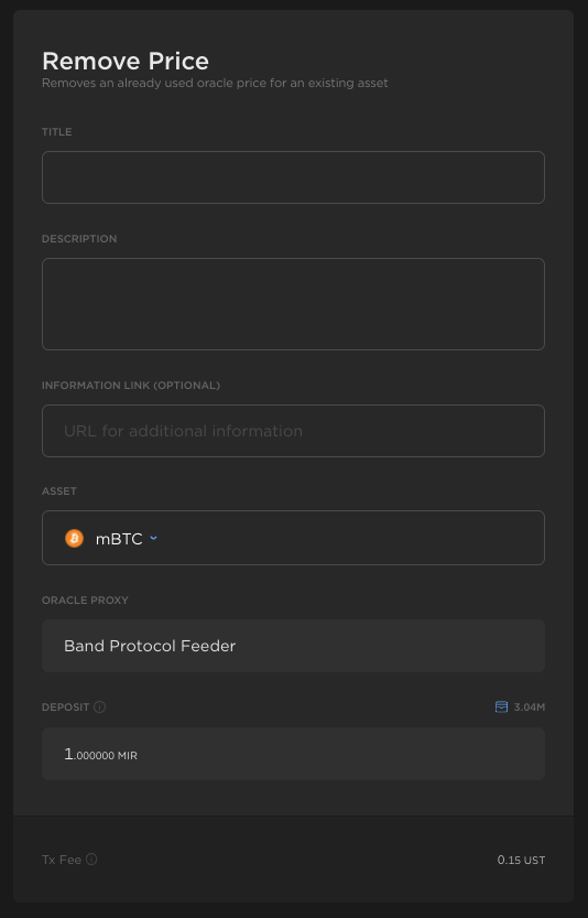 | Asset | Droplist of mAssets on Mirror Protocol, which to change price priority for | Required |