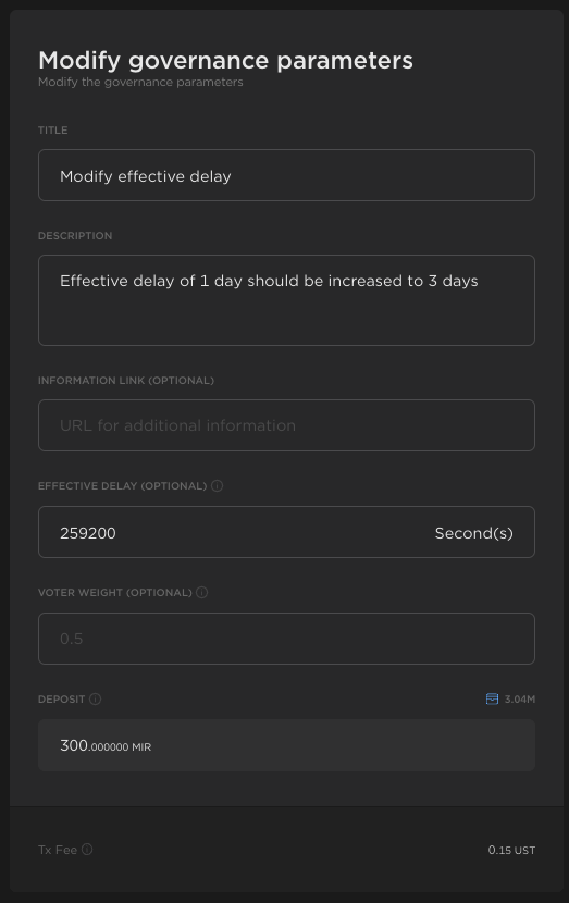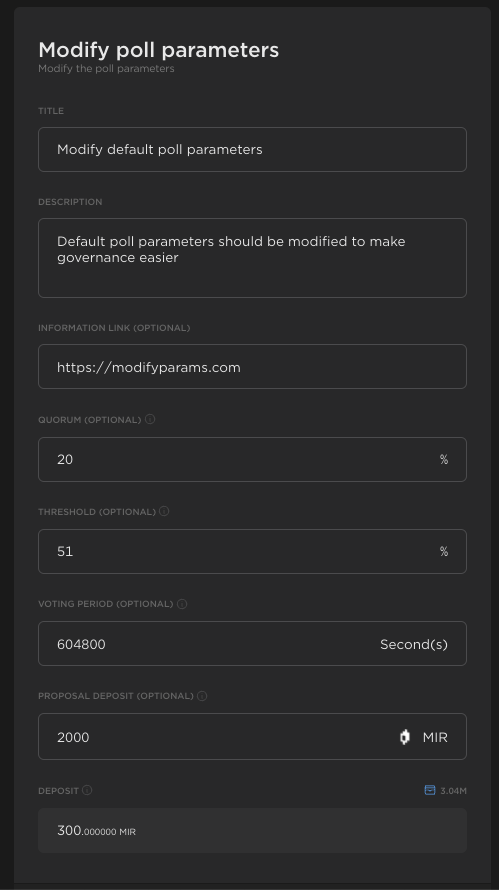 | Proposal Deposit | Required deposit to start a poll (in units of MIR) | Optional |