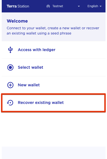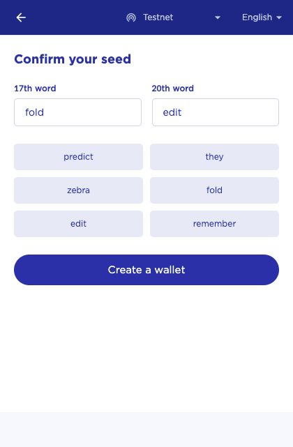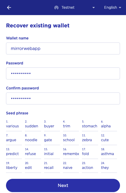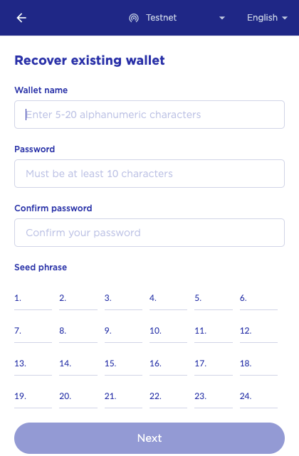 3. Enter the 24 word seed phrase of the wallet to recover and select Next to finish.