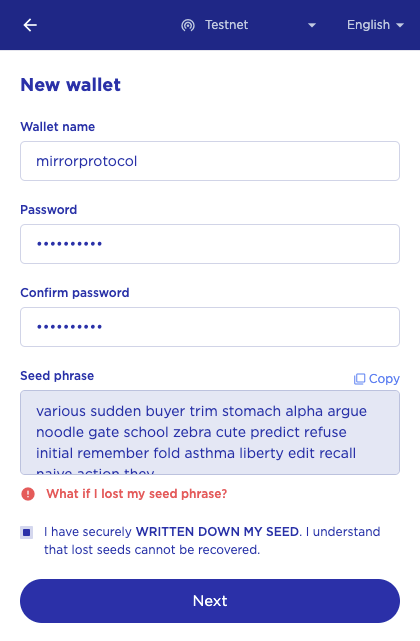 3. Set wallet name and password. Make sure to record 24 word seed phrase somewhere safe. Select Next to proceed.