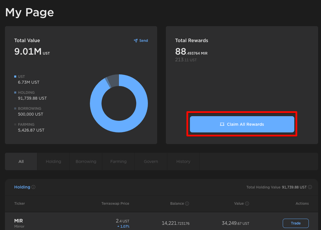Although reward is distributed in three different channels, they are all claimable by executing one transaction from My Page.