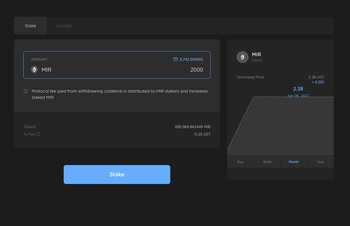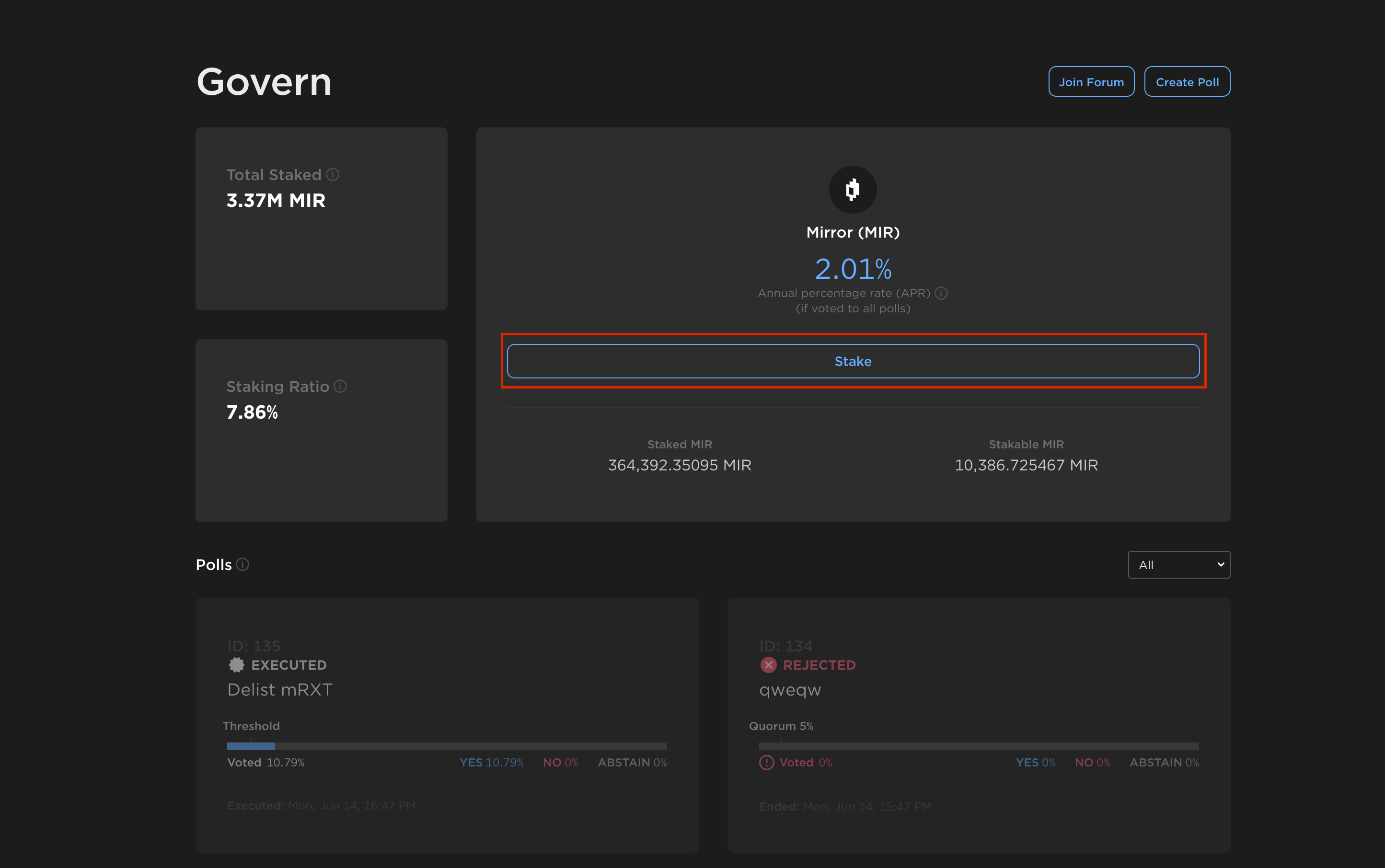 - Market information about MIR Staking: Information about current staked MIR in the market, staking ratio and maximum APR are displayed. To learn how APR for governance is calculated, refer to this page.
