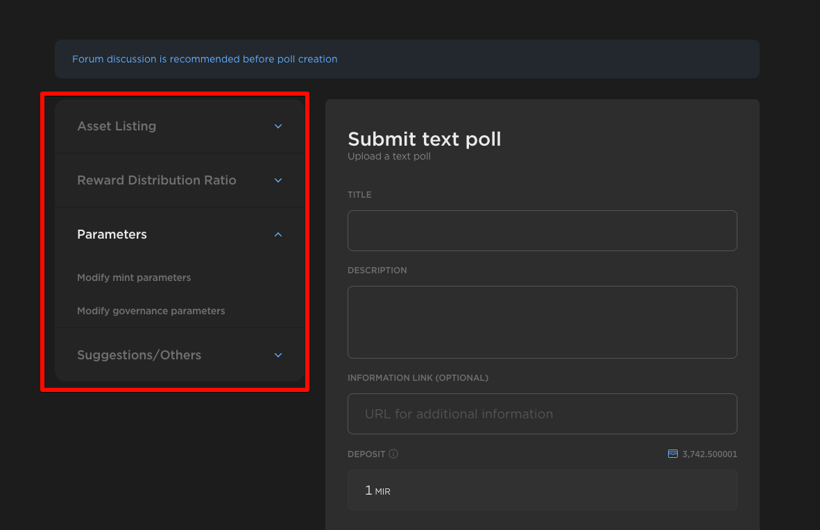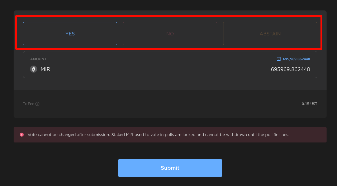 quorum(initially set to 10% on Mainnet) of the total staked MIR. Regardless ofYESratio, the poll will not pass if it does not meet the quorum. - YES votes must be greater than NO votes