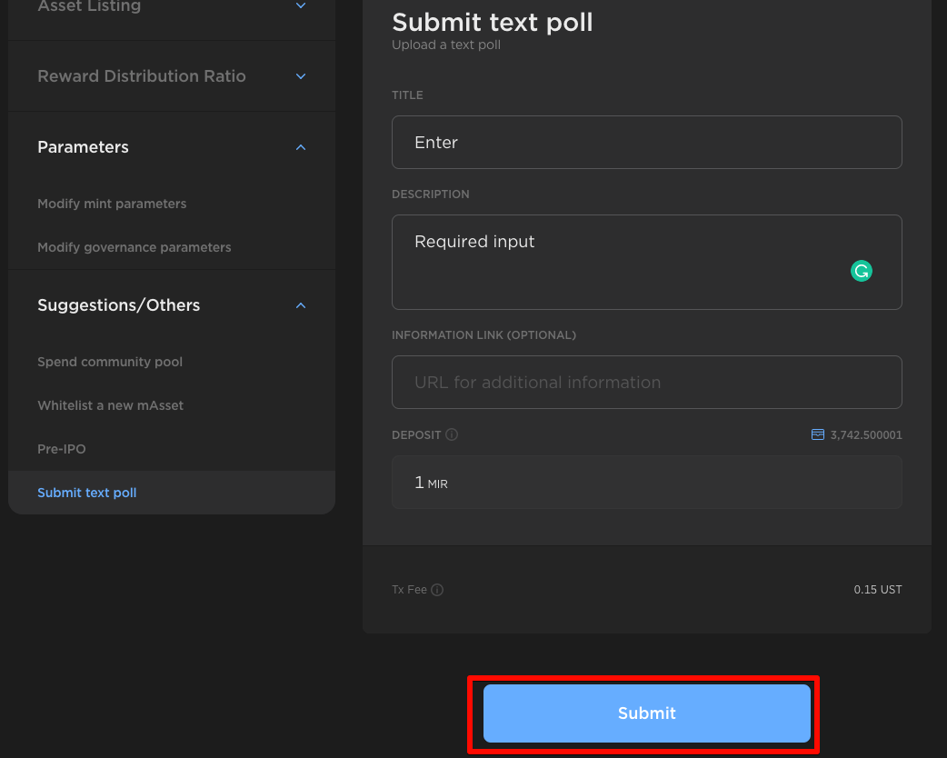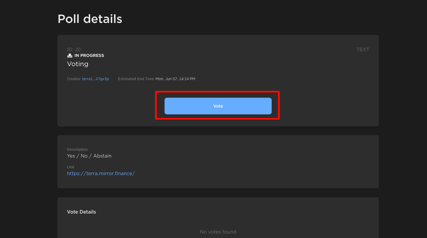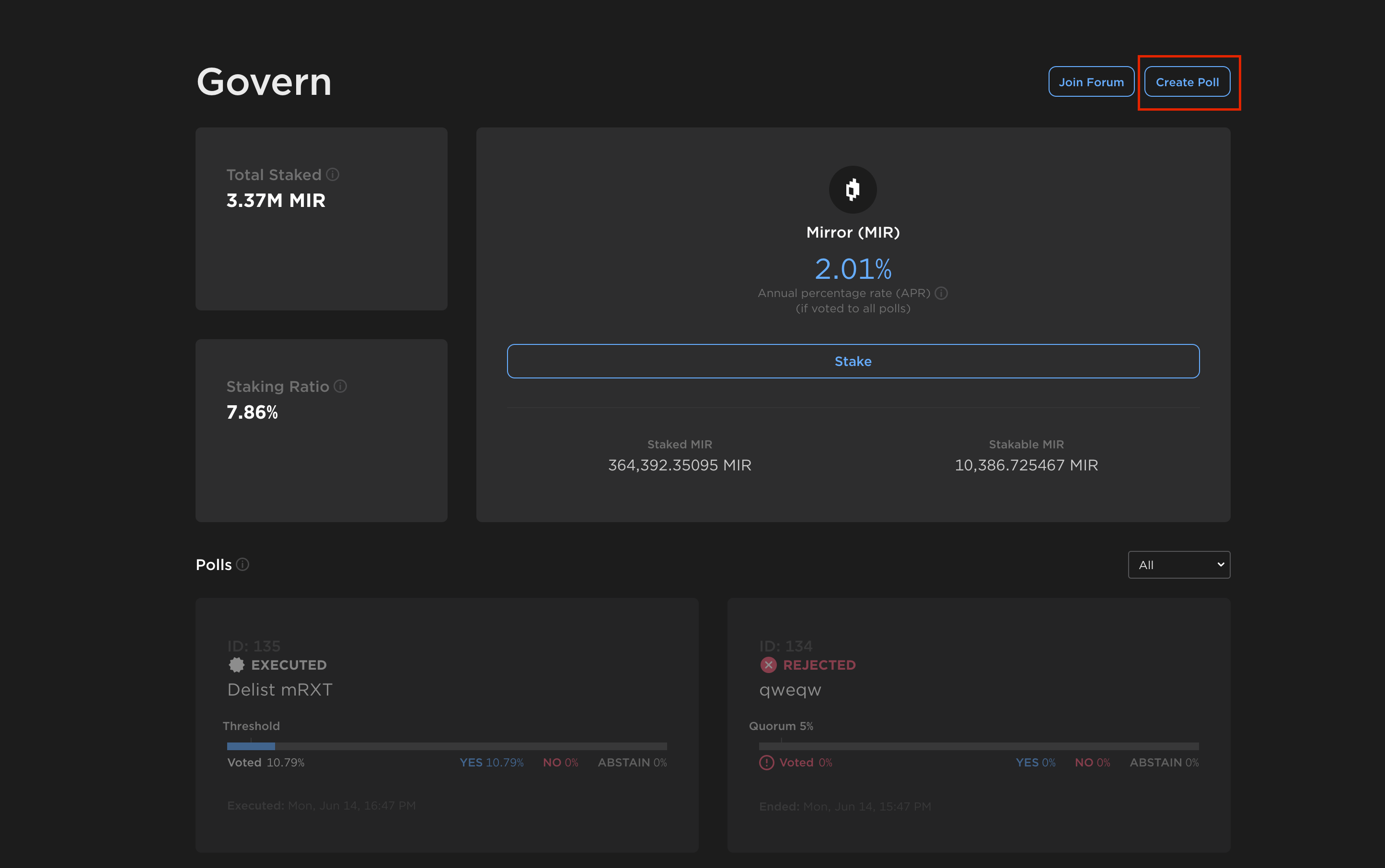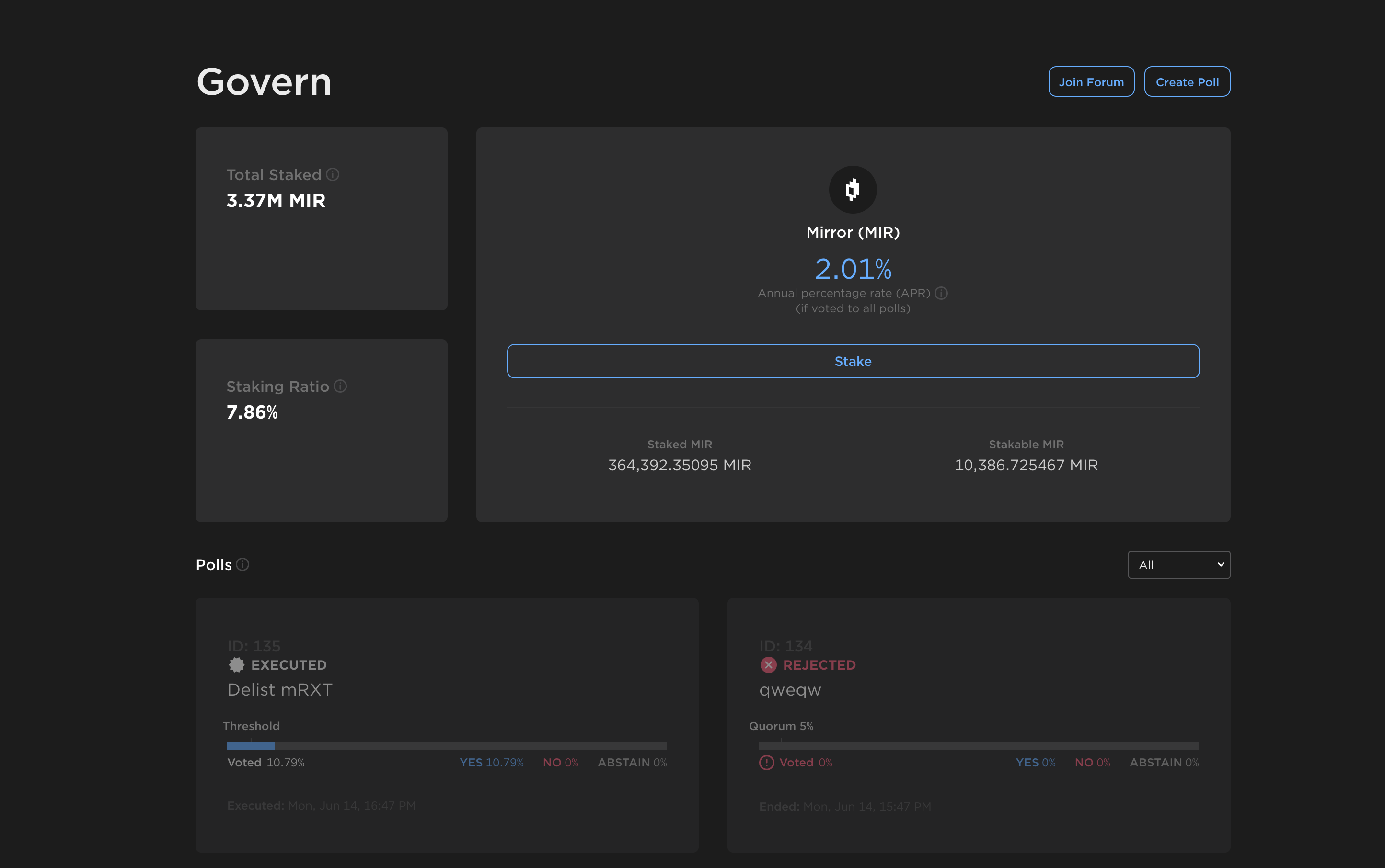The Governance page displays operations related to MIR staking and creating / voting on polls. For more details regarding the Mirror Governance process, click here.