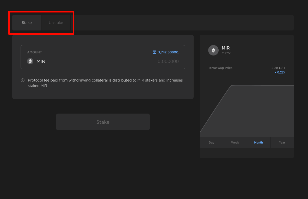- MIR Staking Position: MIR staking pool box displays user's staked and unstaked MIR balances.