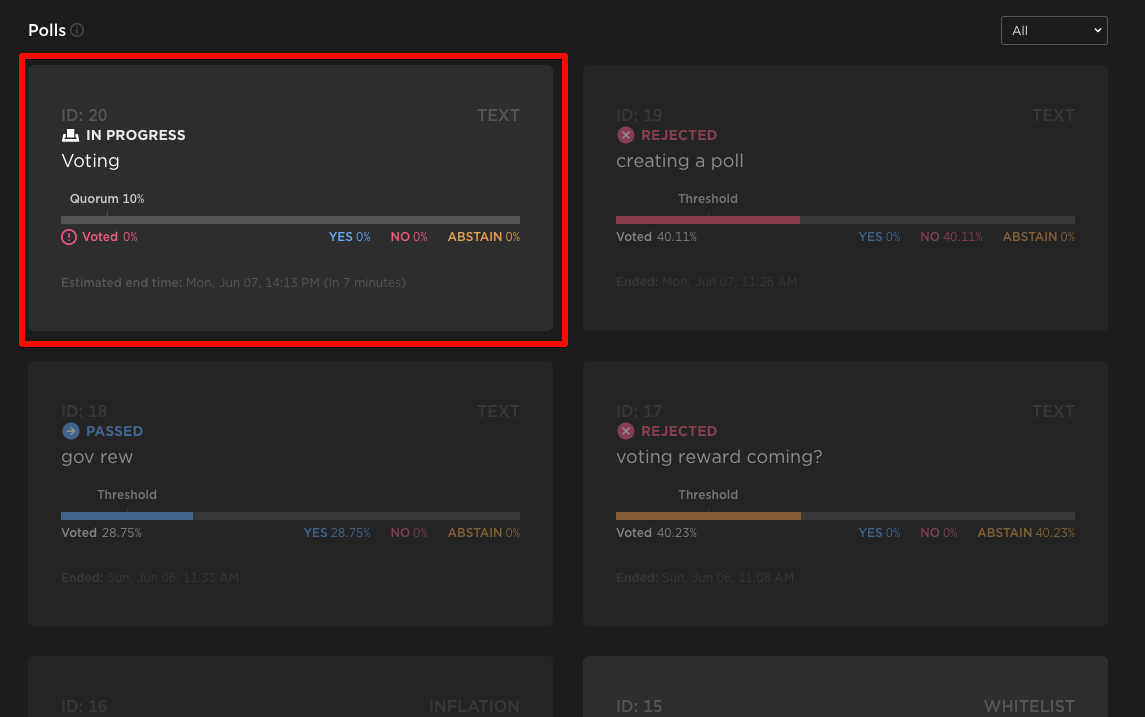 - Poll History: Each poll has a unique poll ID, poll type (whitelist or parameter change), poll result, voting ratio, and end time.