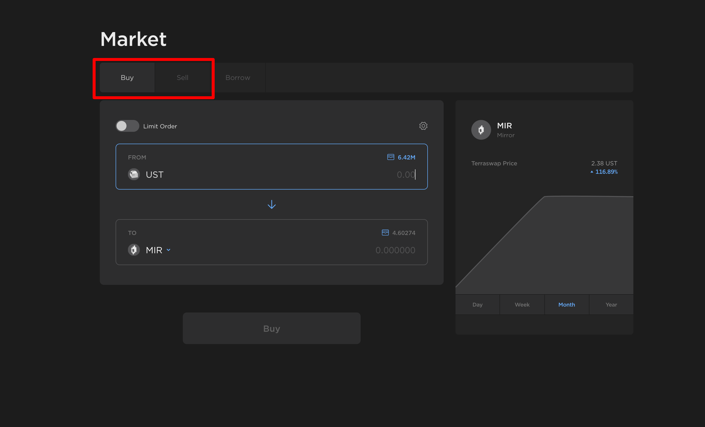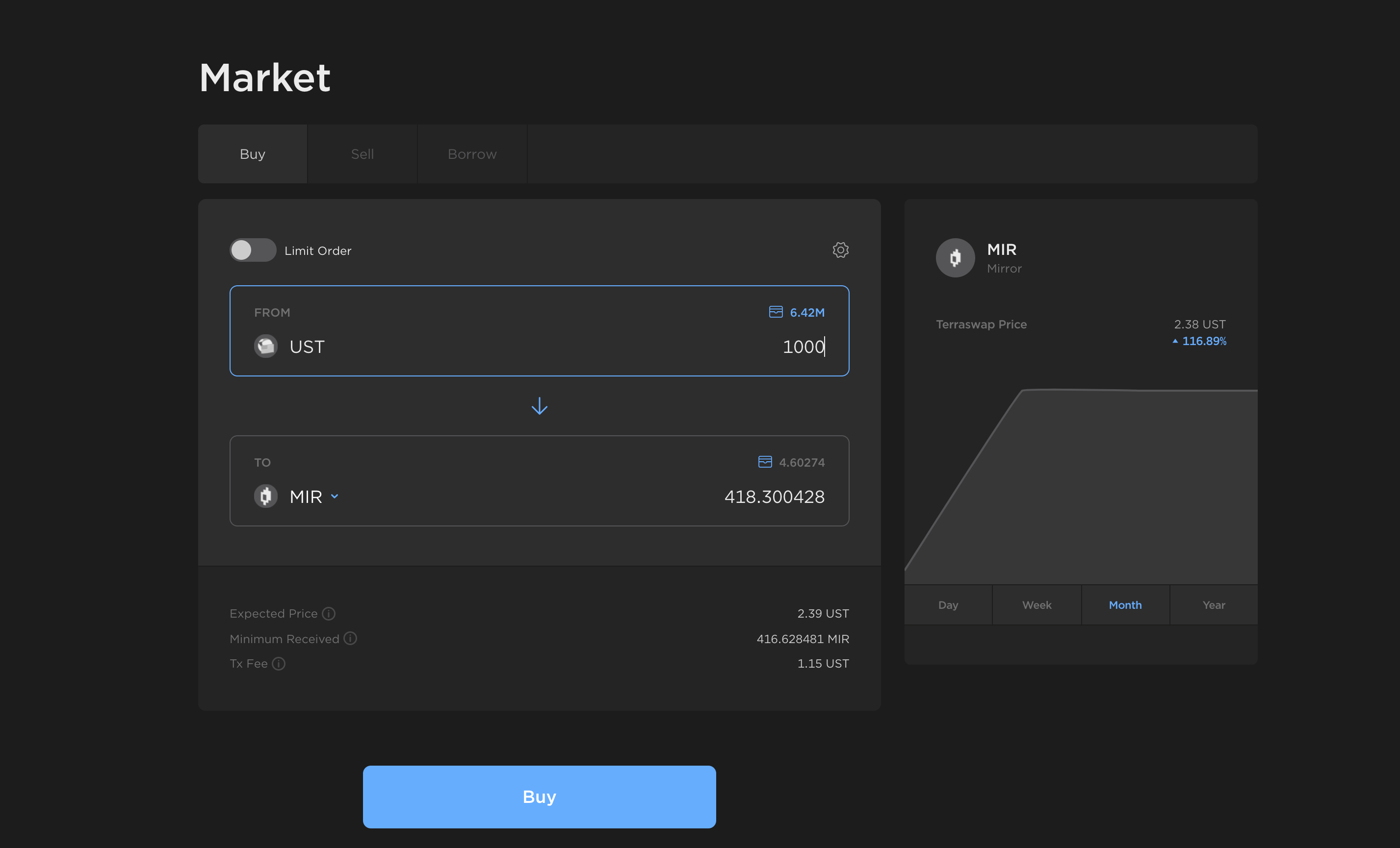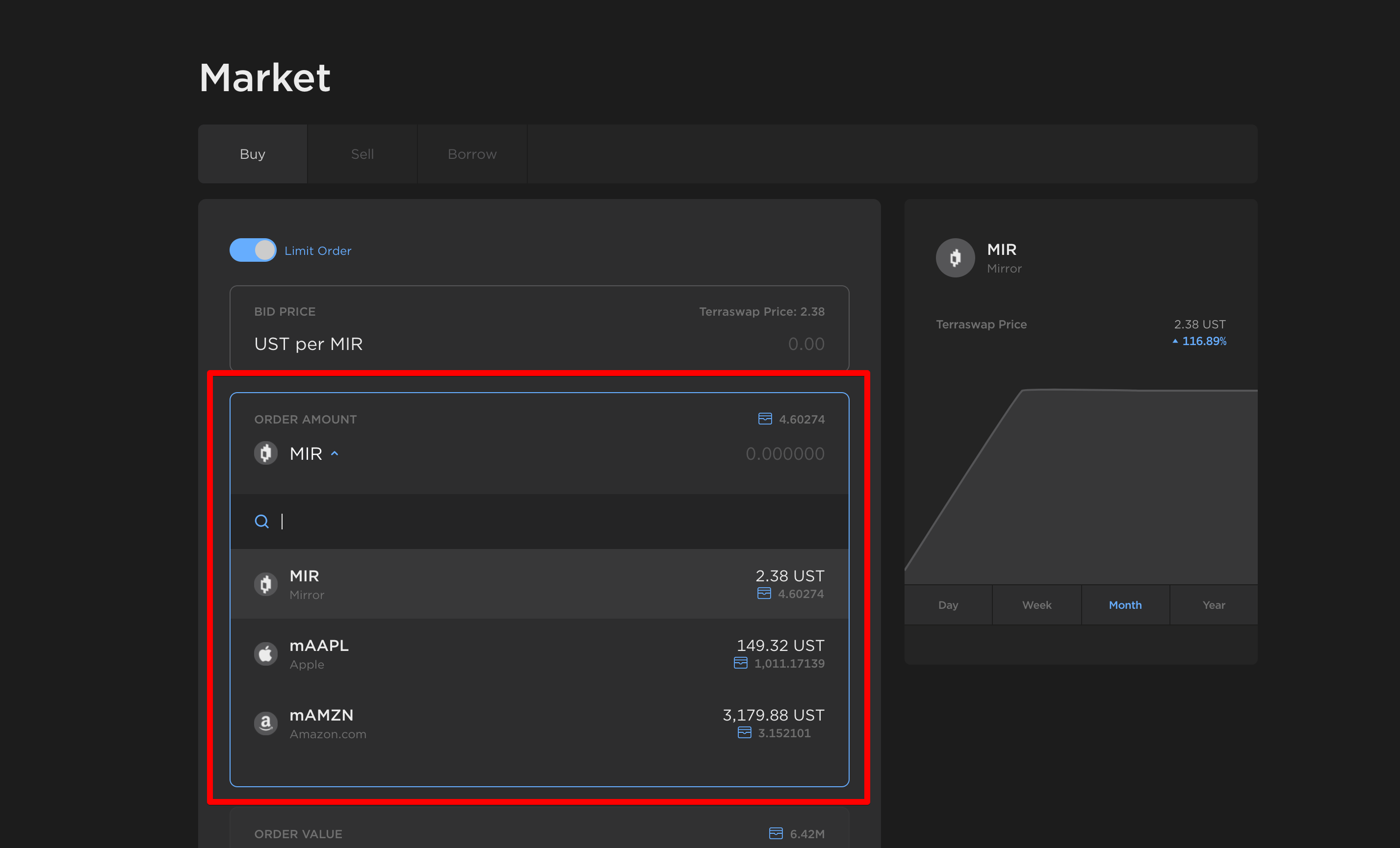The Market page provides an interface for trading and borrowing of mAsset tokens. Trades are made against the asset's Terraswap pool and priced algorithmically by its automated market-making algorithm.