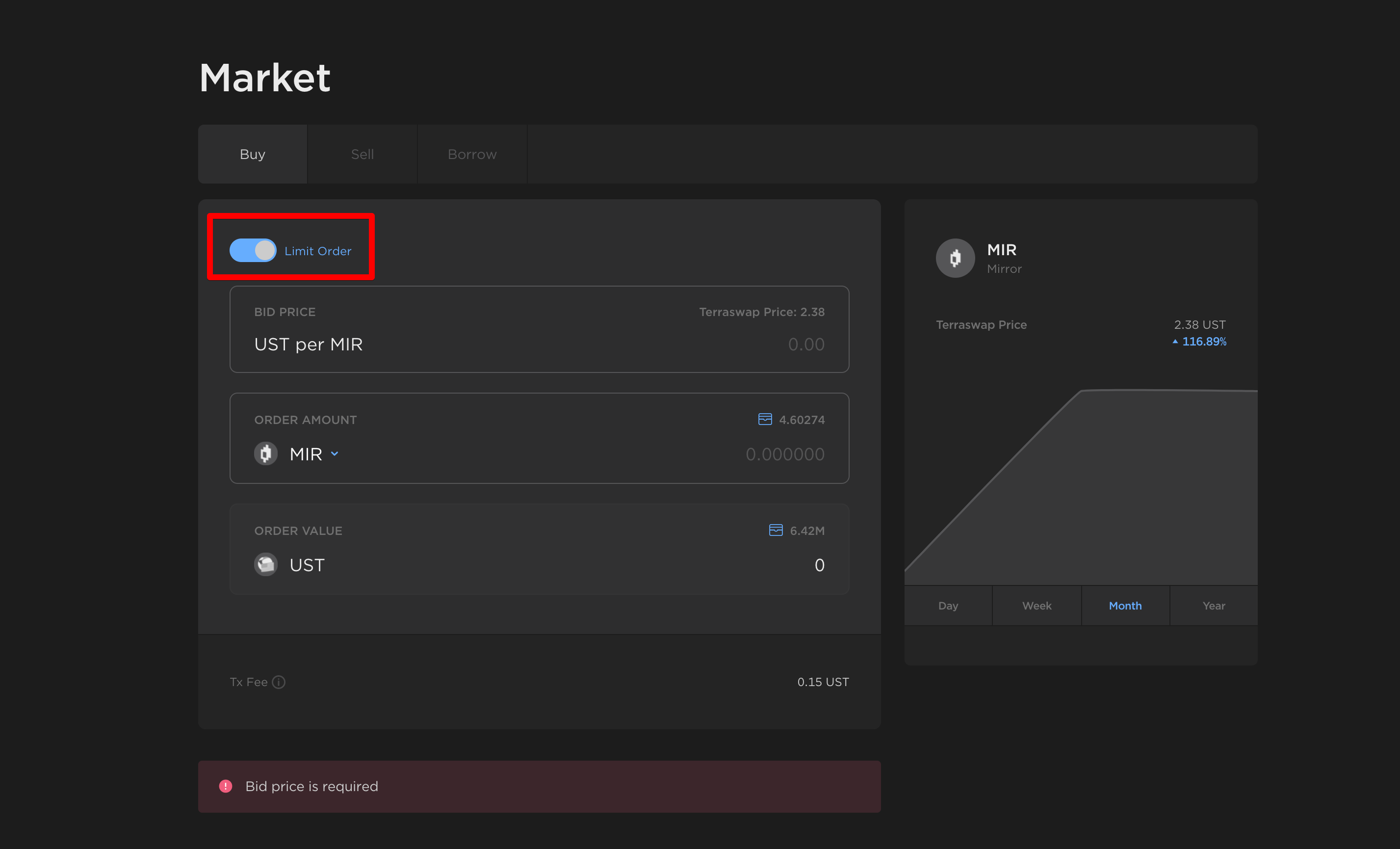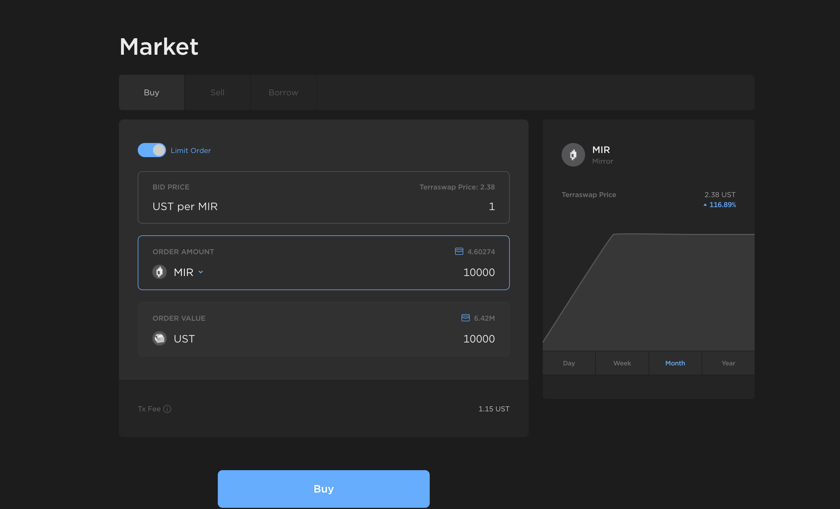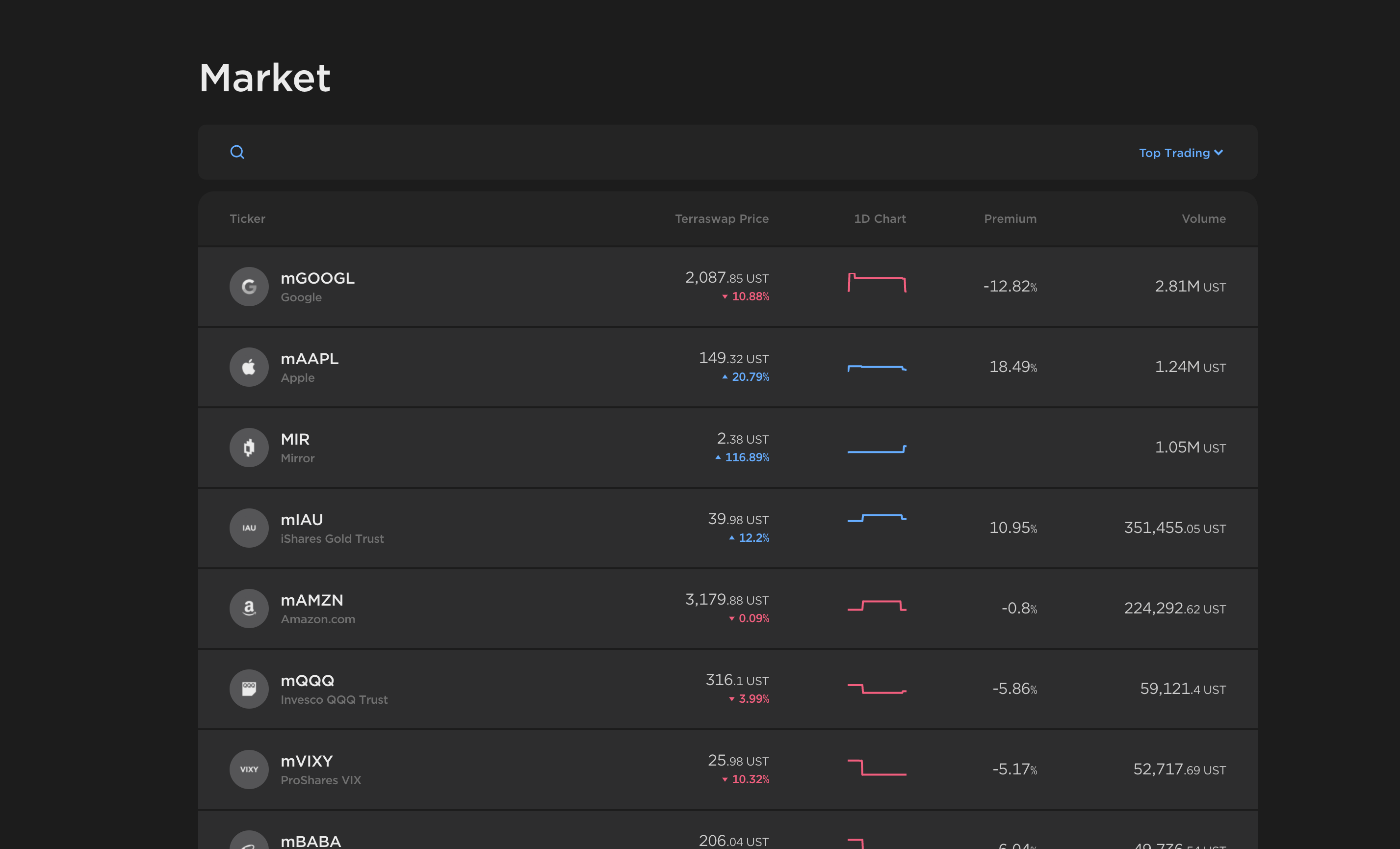 The Market page provides an interface for trading and borrowing of mAsset tokens. Trades are made against the asset's Terraswap pool and priced algorithmically by its automated market-making algorithm.