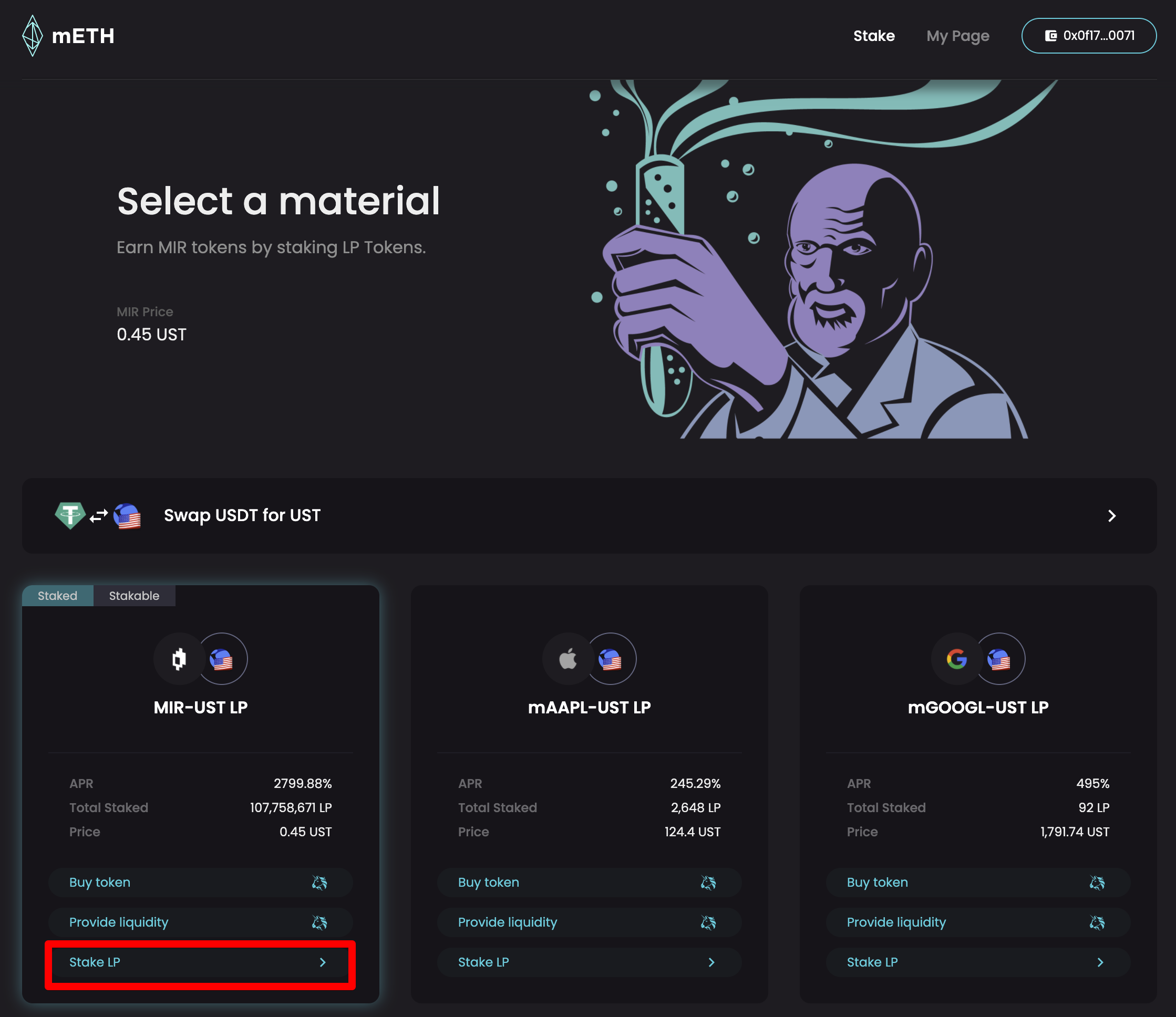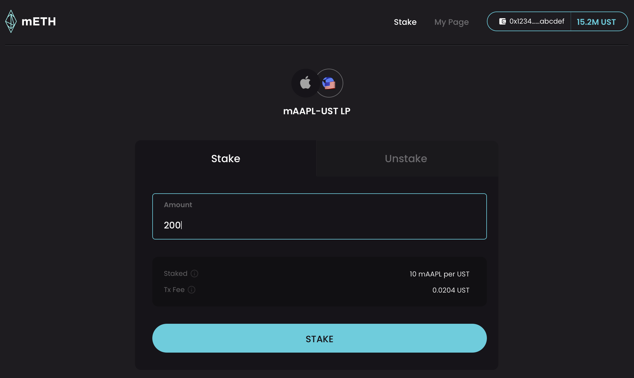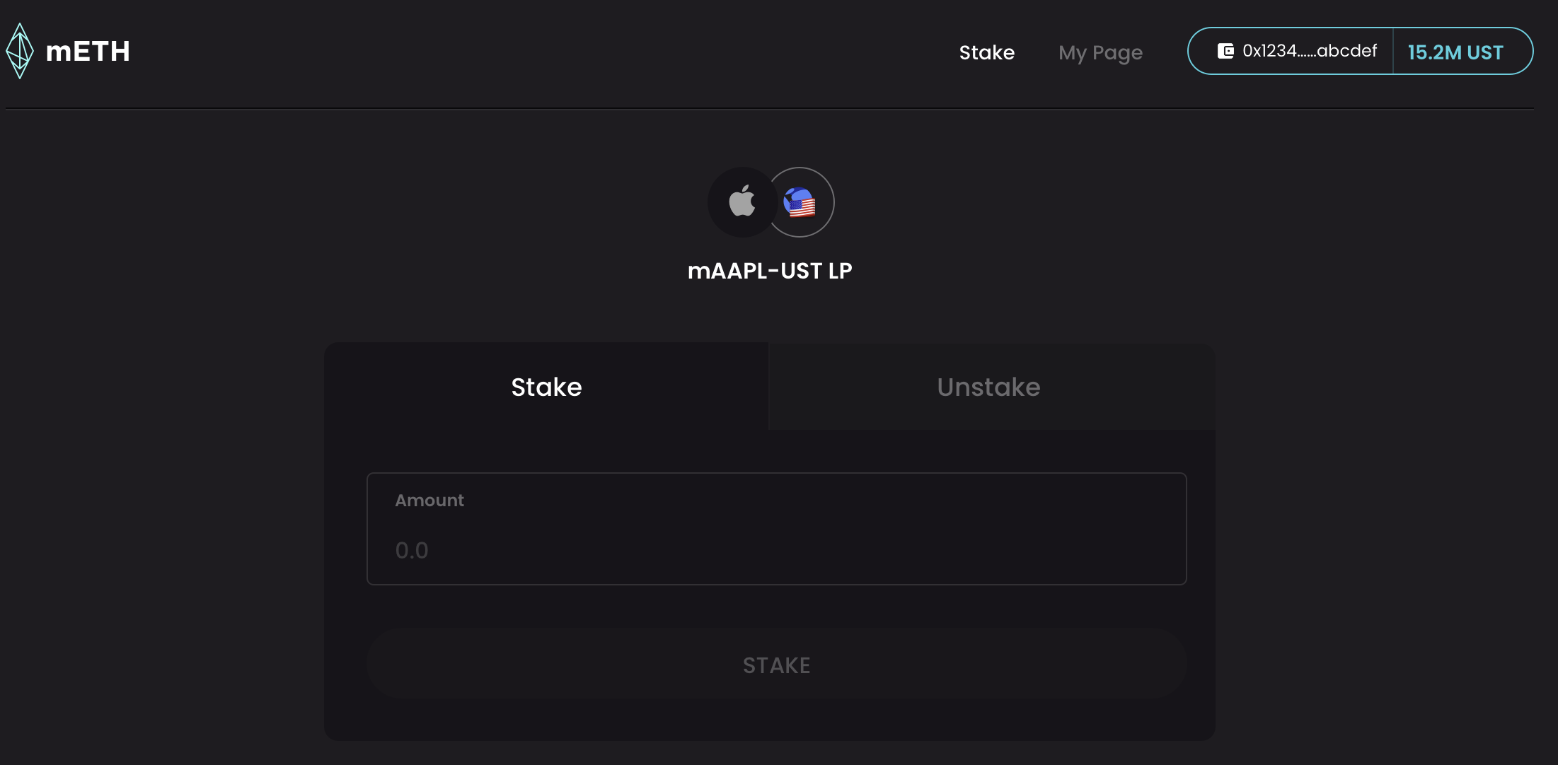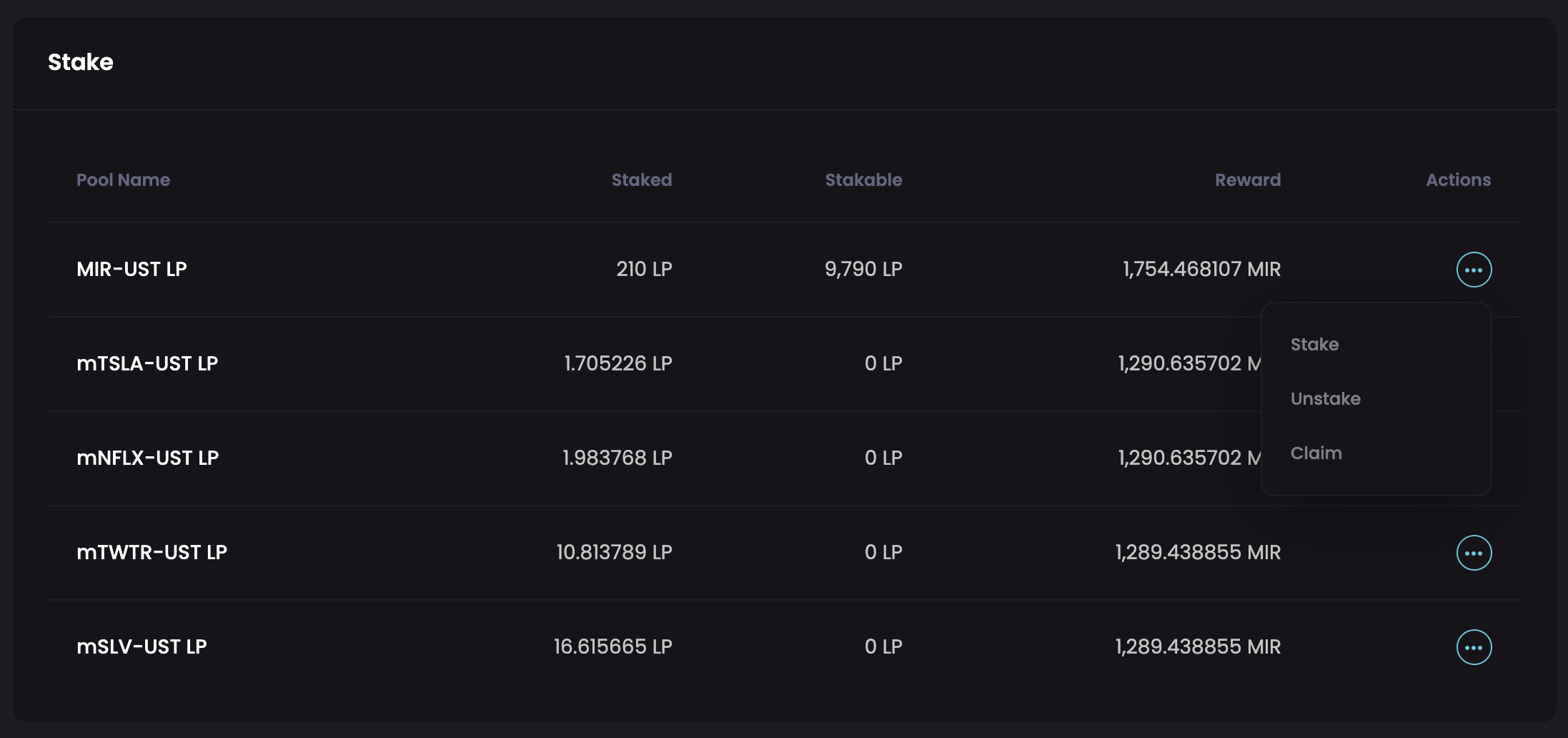 Users can stake mAsset-UST LP or MIR-UST LP tokens to earn MIR reward.