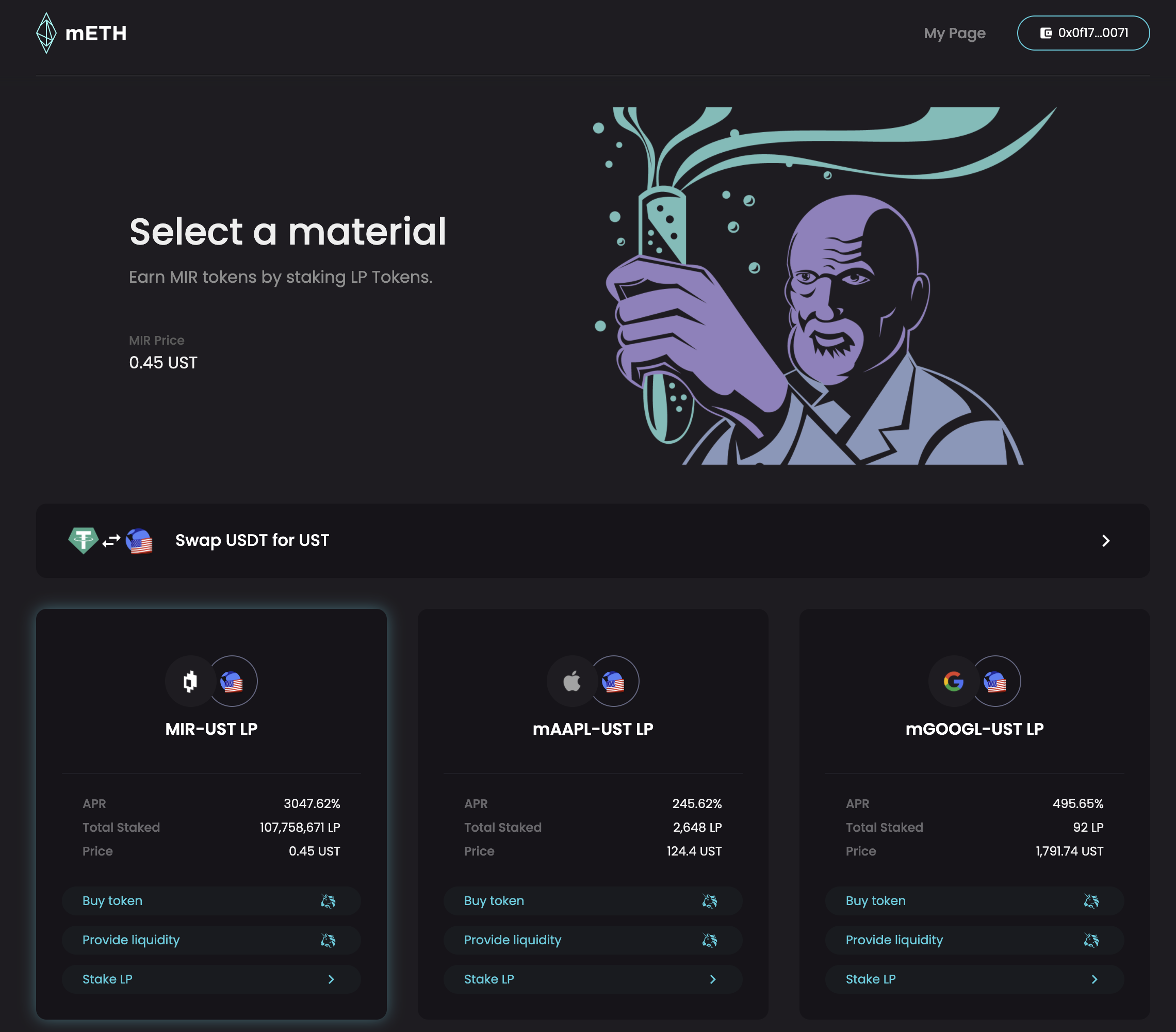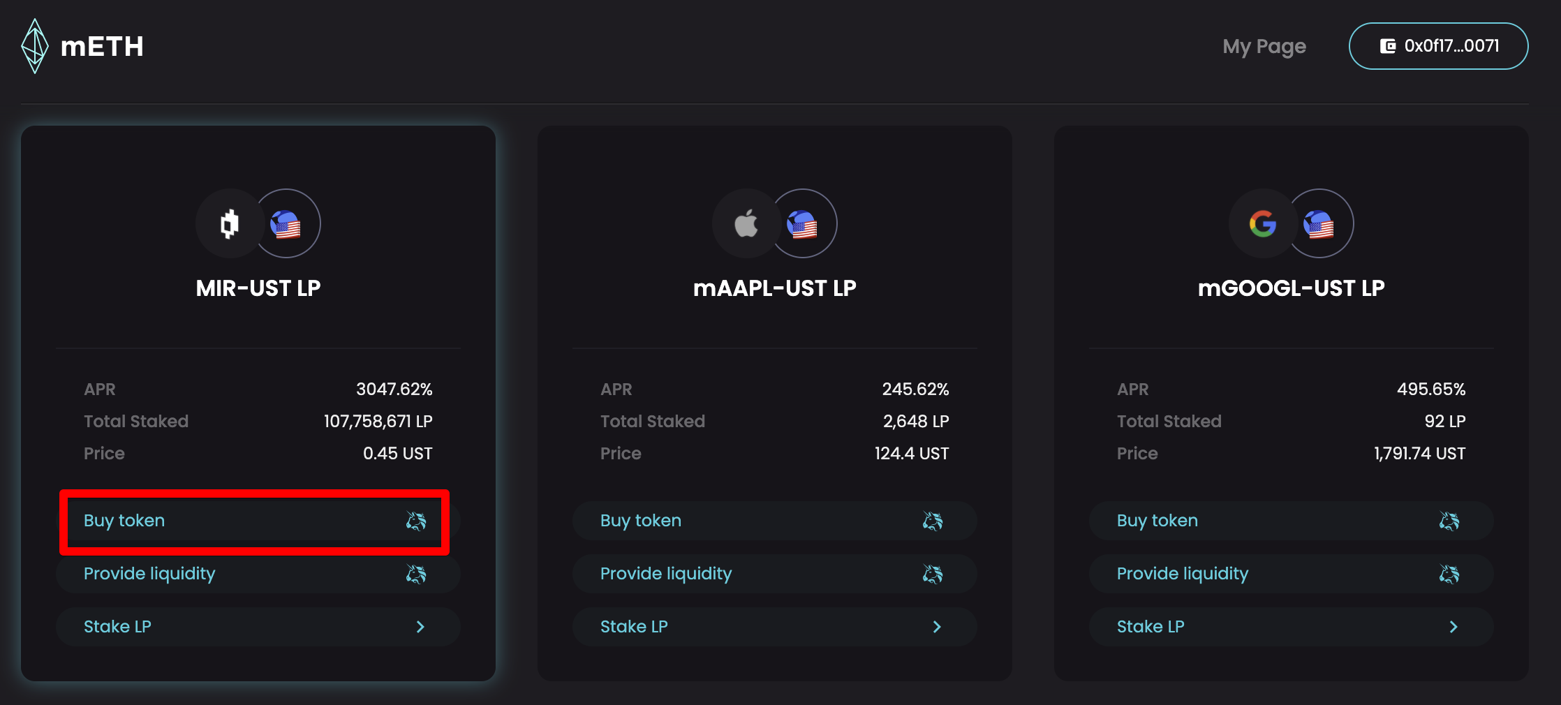 2. From the provided list of mAsset pools, select a token to trade and click Buy token