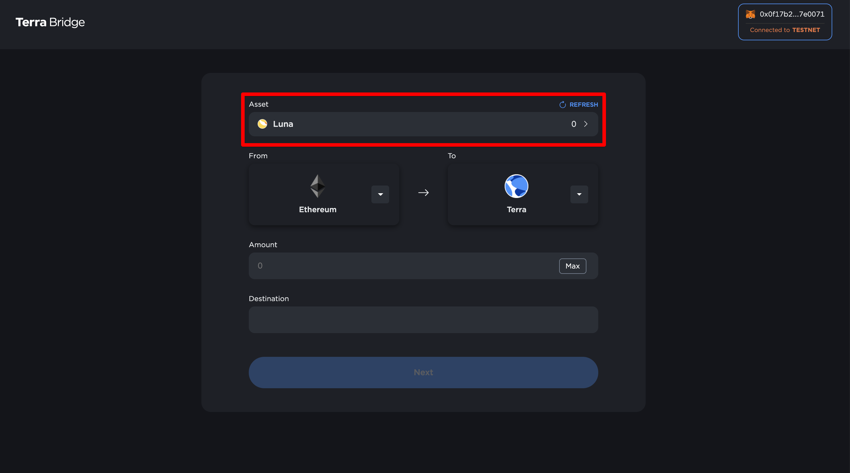 3. Once the right wallet is connected, click on Assets section to select the token to transfer.